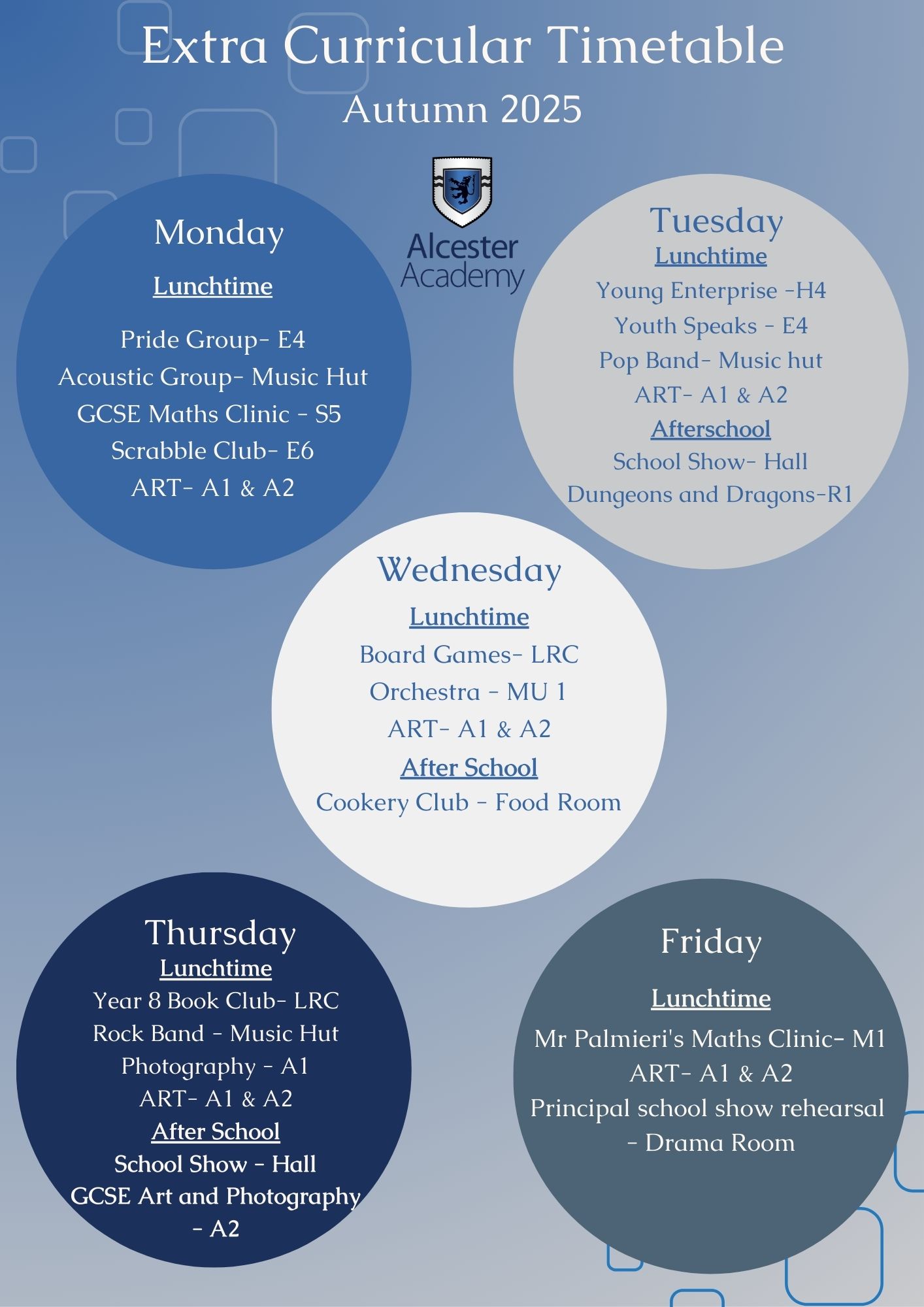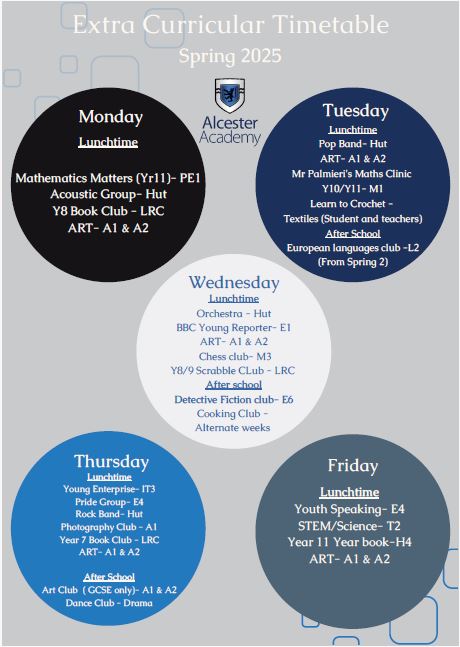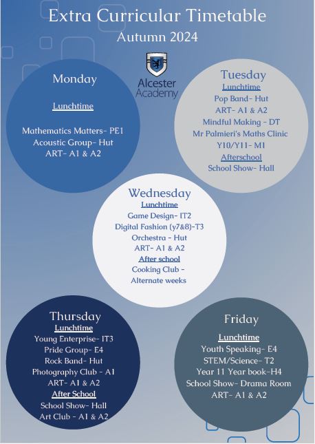 Alcester Academy create an extra-curricular timetable which is given to students at the beginning of the year. Pupils will be invited to join as many clubs as they would like. We are just finalising our offer for next year and a link to the latest timetable (below) will be available in September.