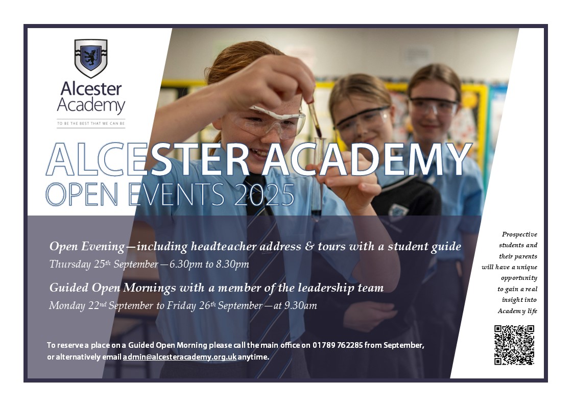 Guided Open Mornings with a member of the leadership team Monday 22nd September to Friday 26th September at 9.30am. To reserve a place on a Guided Open Morning please call the main office on 01789 762285 from September, or alternatively email admin@alcesteracademy.org.uk anytime.