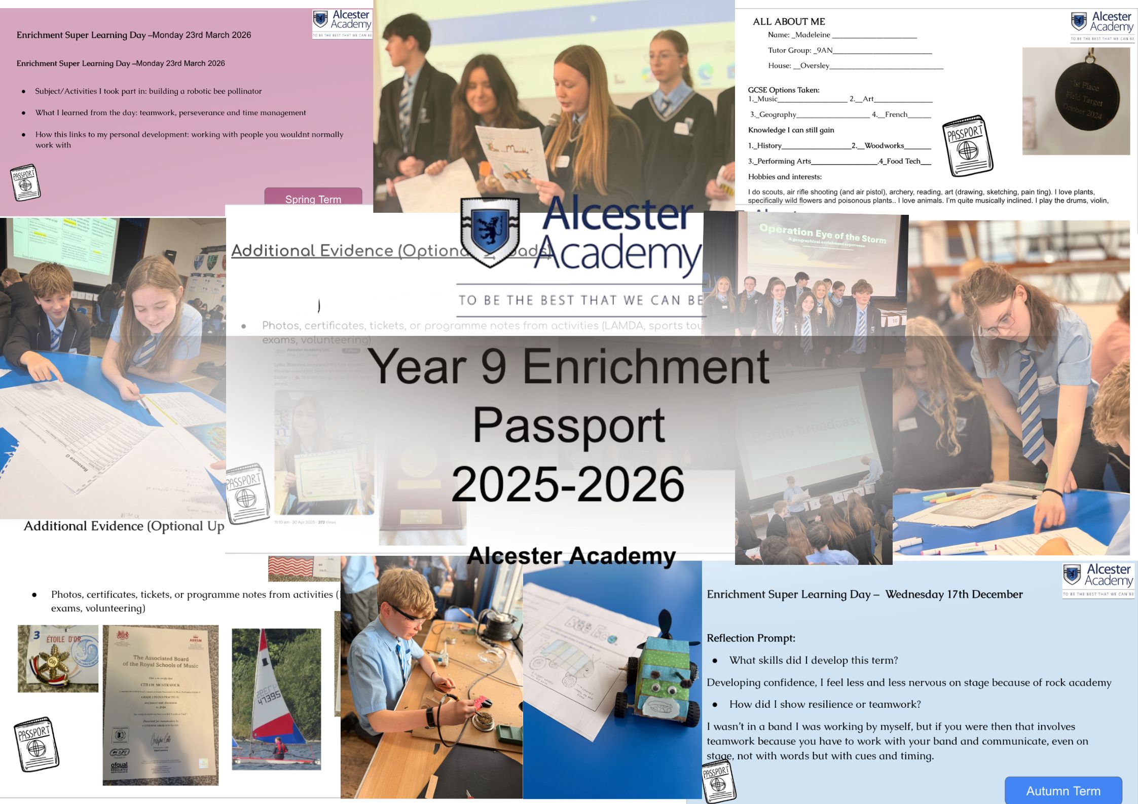 The Year 9 Passport also aligns with our wider commitment to preparing students for life after Alcester Academy. It complements our careers education programme, extracurricular offer and pastoral support, and helps build strong habits of self-reflection and ambition. Our aim is that students leave year 9 with a growing understanding of themselves, clear aspirations and a strong sense of pride in what they have already achieved.